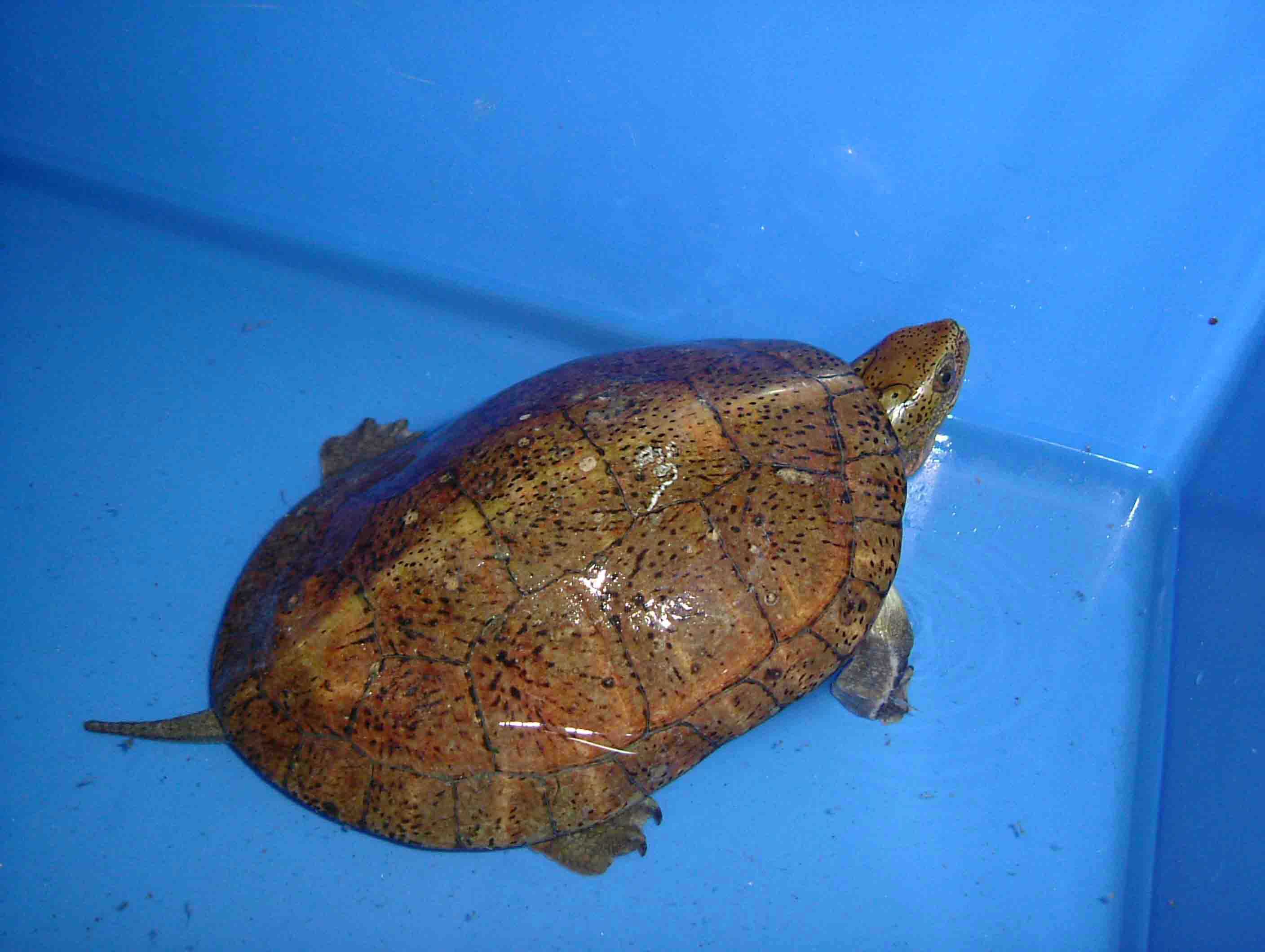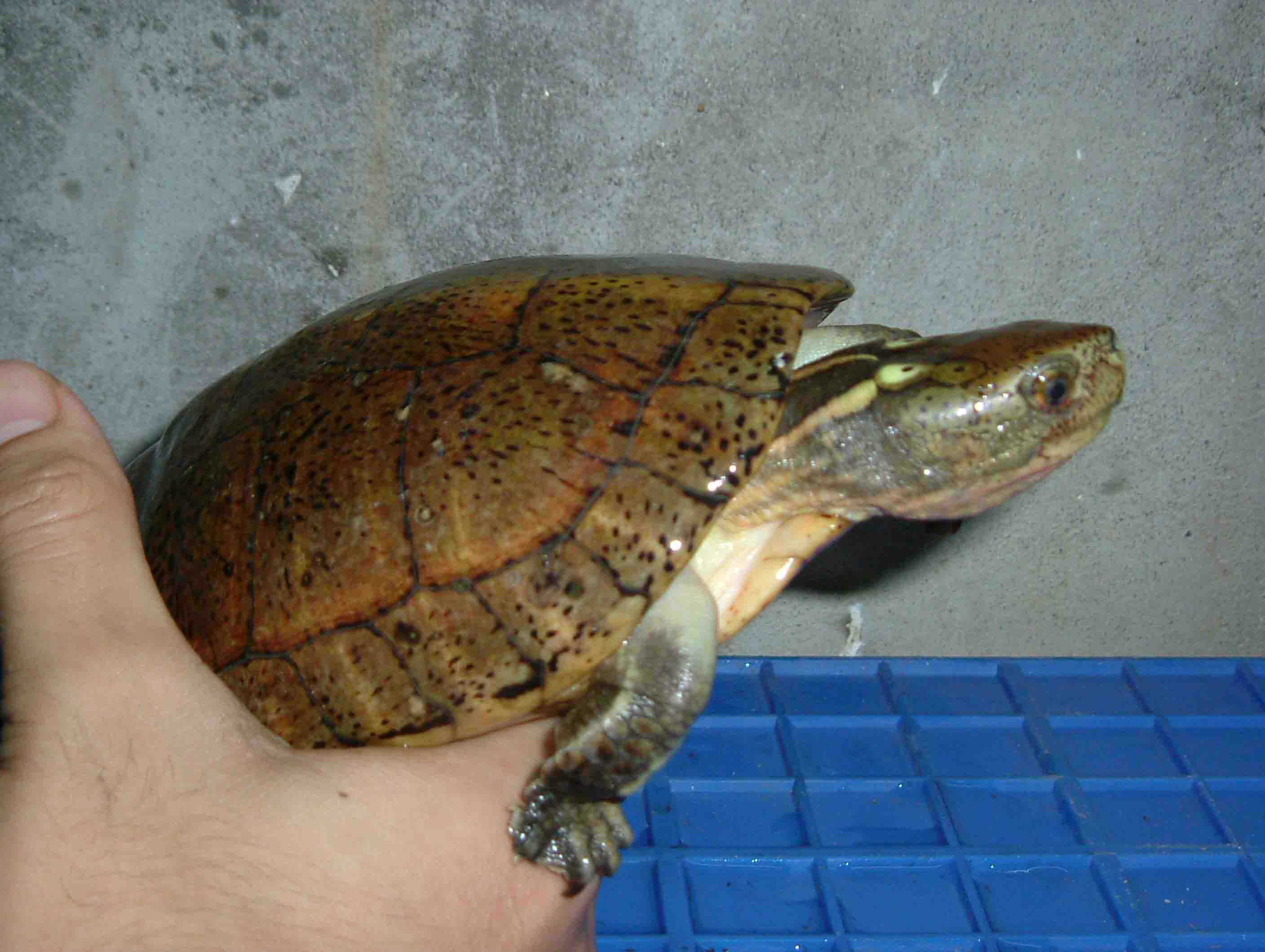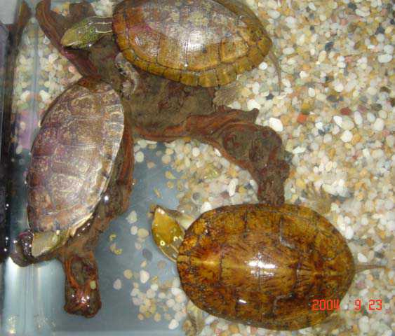 3.日常管理 四眼斑龟是变温动物,其活动、进食的多少随环境温度的变化而变化。所以,日常饲养中对气温、水温的记录非常重要。通过对温度的观察,及时掌握龟的活动、进食情况,尤其注意龟的进食量,如有些龟一般能食25克肉,但突然仅食很少食物,并持续2~3天,这是不正常的现象。另发现水中有蛋清状物或血红色团状粪便,这是龟患肠胃病的症兆。有些龟虽粪便不正常,但仍能进食,不易引起注意,这就需要仔细观察,及早发现病情,为治疗提供充裕的时间,否则到晚期也无能为力。 |