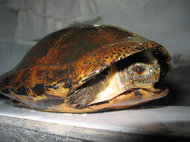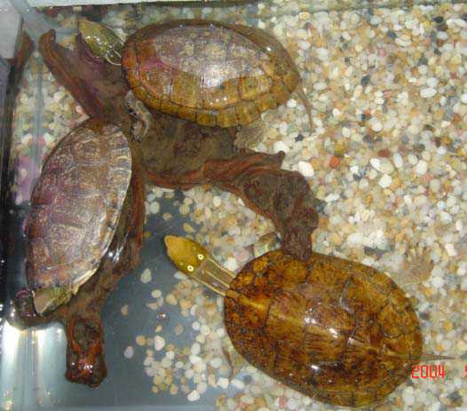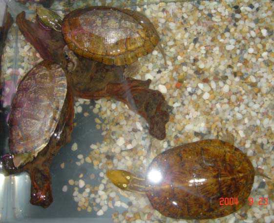 2.水质管理 四眼斑龟是水栖龟类。水质的好坏直接影响到龟的健康。在日常饲养中应做到二勤:勤换水、勤捞残杂。初春,由于龟进食量不稳定,投喂的饵料常有剩余,在投喂3小时后,将残饵及时捞出。每周换水1次,一般在喂食后2~3天进行,注入,新鲜水的水温应与原水温相差不大,一般不超过5~6°C为宜,否则,龟易患肠胃等病症;夏季,喂食后3~5小时换水;秋季,宜在中午换水,以免早晚温度低,影响龟的健康;冬季,龟停食,每月换水1次。无论在何季节,每次换水均需消毒,消毒的药物应经常更换,以免形成耐药性。