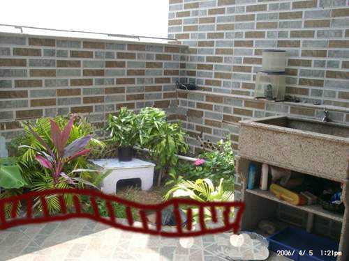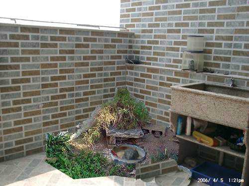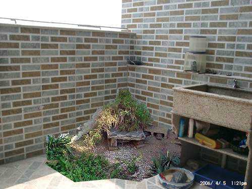 解释一下,沿着墙面做假山完全是美观的需要,养龟有可能会给家里其他成员带来一点点的不便,至少也占用了一些空间,要让家人完全接纳,最好的办法就是搞的好看一些,把龟的环境当成是一种“盆景”。假山下面是水池,我不知道墙后面的房间是什么,如果是卫生间就无所谓。如果是卧室还应该做点防水措施,详细做法问SQ~假山的另一个好处就是能很好的遮挡做防水的墙面,不至于太难看。别的就没有什么好说的了,填土,搞一棵植物。我觉得七里香挺合适,不会很大,叶子也茂密。没养过黄缘,不过据说黄缘喜欢有点遮挡的地方。所以搞一颗叶子密的。黄缘比较凶猛,到处拱,七里香命硬,经的起精神+肉体的折磨。