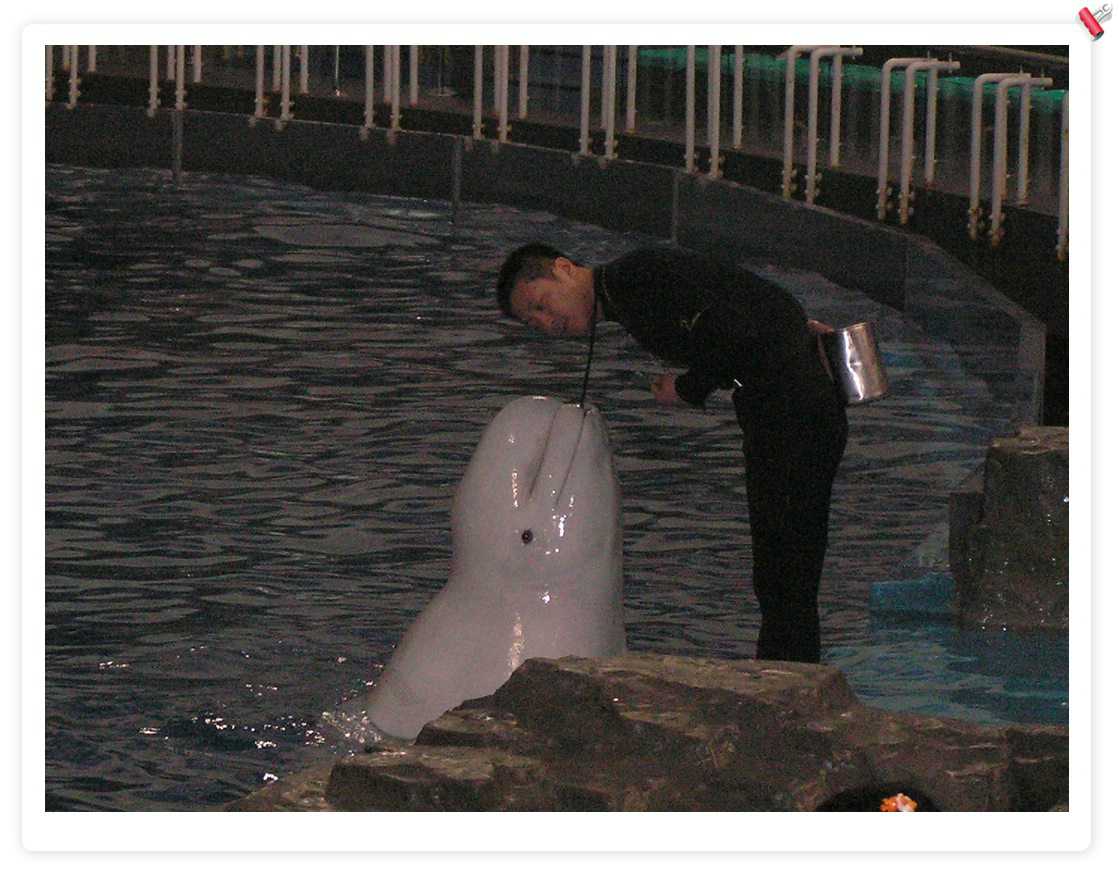 可怜白鲸,为了点小鱼就要亲亲训兽员