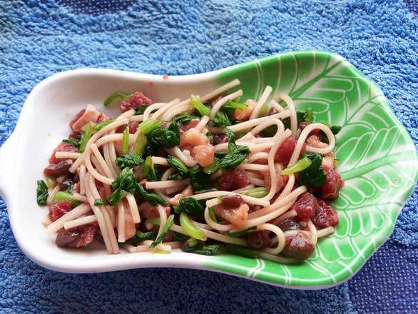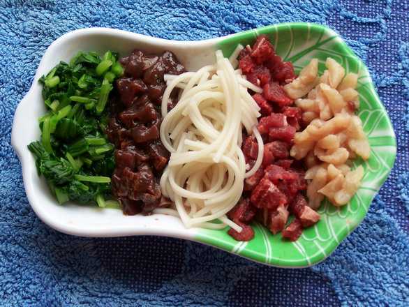 今天的食谱:青菜、面条、牛肉、鸡肉、猪肝。