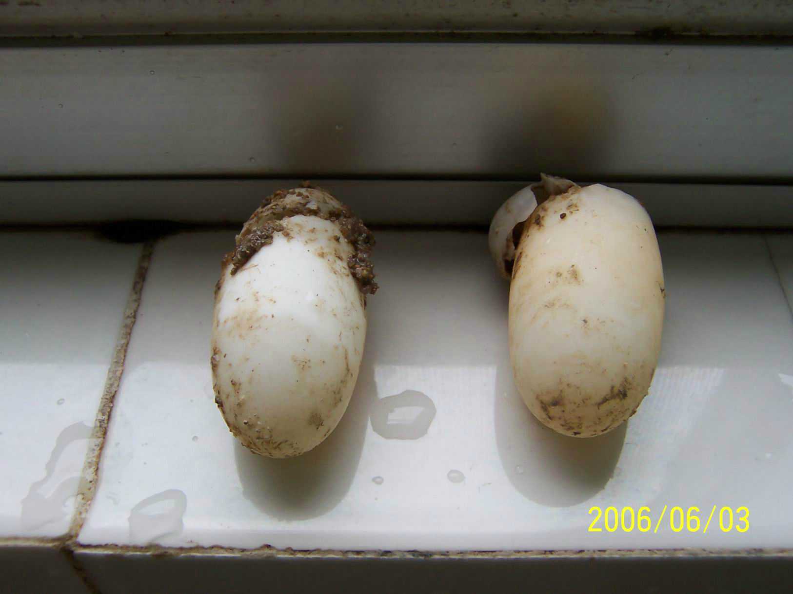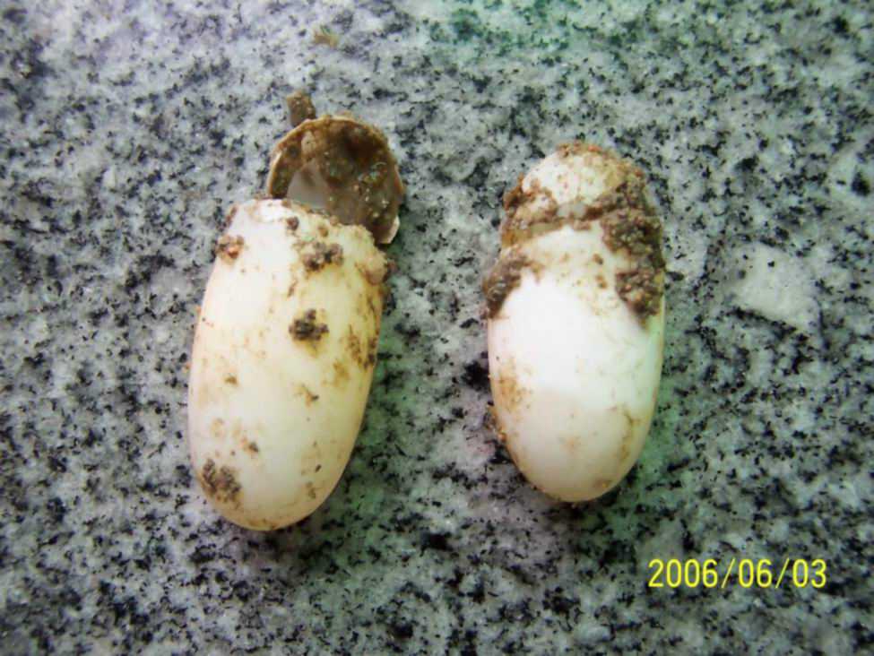 今天休息,清理龟池,顺便再找找蛋,没成想,一铲下去················天哪,三个蛋破了两个,其中一个还是受精的,照片里可以看出,剩下一个完好的没有白斑。这三个蛋也不知道是什么时候下,哎,好好可惜,好好遗憾!!!!!!!!!!!